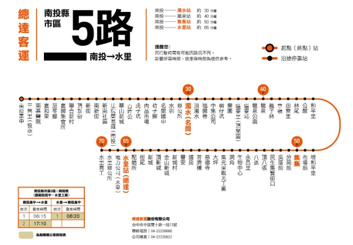 - 路線:06:20水里商工發車⇄水里沿途多站⇄集集沿途多站⇄濁水(名間)沿途多站⇄投高(回程1710發車)